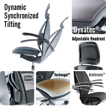 Key Features: • Dynatec® high-tech mesh • Technogel® seat cushion • Lumbar support • Armtronic armrest adjustment • Dynamic Synchronized Tilting • Adjustable headrest with 8 movable positions |