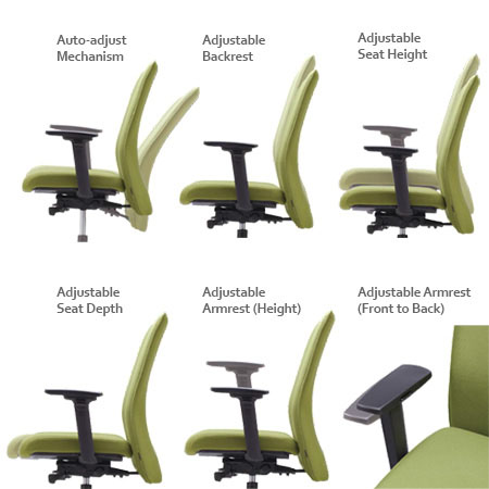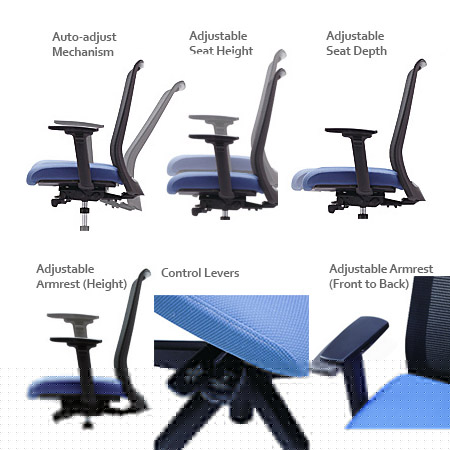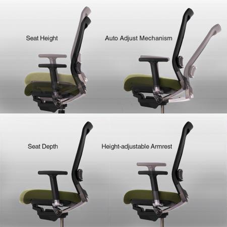 Features & Functions: • Auto Adjust Rocking: Intelligent weight-sensing function synchronizing the seat and backrest without any levers. • Adjustable Seat Height/ Seat Depth/ Armrest Height • Adjustable Backrest(can accommodate different body lengths) • Adjustable Armrest Pad (Front to back) • Greenguard-certified |