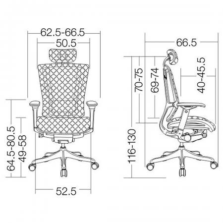 • Mesh executive chair • High back with adjustable headrest • Adjustable arms • Synchro mechanism for simultaneous adjustment of seat and back rest • Adjustable lumbar support • User tension control • Knee tilt • Approximate dimensions (mm) H1175 W550 D600 • Weight: 19 kg Dimension: • Seat Width: 510mm • Seat Depth: 490mm • Back Width: 500mm • Back Height: 610mm • Seat Height: 440-540mm |