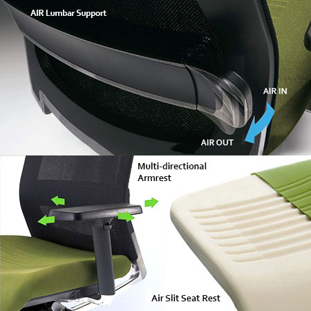 • AIR Lumbar Support: Inflatable air bag concealed in the lumbar-support area can be adjusted to suit the curvature of the user’s spine. • Auto Adjust Rocking: Intelligent weight-sensing function synchronizing the seat and backrest without any levers. • Adjustable Seat Height / Seat Depth / Armrest Height • Multi-directional Armrest (Armpad) • Air Slit Seat Rest: Grooves in seat foam, dual layer of breathable fabric upholstery • Quality casters in Hard Nylon or Soft Polyurtherane |