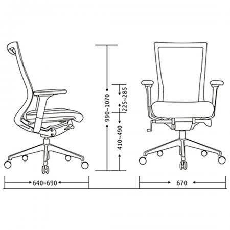 • Molded foam cushion seat with Mesh backrest • With seat slide for seat depth adjustment • Synchronous Tilt Mechanism with lock • Height adjustable lumbar support • Pneumatic seat height adjustment • With height adjustable armrest -5 pronged nylon base with caster • Dimension: W-72 cm, D-70 cm, H-115 cm • Seat Size: W-42 cm, D-46 cm • Back Size: H-57 cm, W-49.5 cm • Seat Size: 47-59 cm |